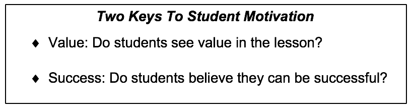 Success is the second key to student motivation. Students are more motivated when they feel like they are successful or that they have a chance to be successful. If Dustin thinks an assignment is too hard, and that he must complete it on his own, he is likely to give up. But, if he is given a challenge, as well as assurances from you that you will be there, even from a distance, to guide and support him, he will try to accomplish the task, and he will likely succeed.